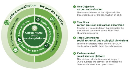 - The carbon neutralization objective for IPs has not been established. There have been many studies focusing on how to reduce carbon emissions in industrial parks through measures such as integrated management solutions, but few case studies have started with the goal of achieving carbon neutralization in industrial parks as a construction and operational objective [84]. Apart from that, research on industrial parks has remained focused on planning EIPs, calculating and monitoring carbon emissions from established EIP resources [85], consolidating and repositioning energy infrastructure, and industrial symbiosis projects [86]. The transition from EIP to zero-carbon industrial park (ZCIP) or the methods and practices of how to build a ZCIP have received scant mention. It is vital to clarify the goal of carbon reduction in industrial parks. A ZCIP must have carbon neutralization as its primary vision [87]. Therefore, its construction goal and operational management throughout its life cycle can be coordinated to achieve zero carbon emissions by working together, significantly increasing the efficiency of carbon emissions reduction [88]. Within such a macro goal, energy management, production logistics, economic efficiency, and human-centered concepts need to be integrated into the system framework of a zero-carbon park [89]. Carbon neutralization is the essential feature that distinguishes a ZCIP from a traditional industrial park. It is also the principal basis for developing strategies in a park’s construction process. The ZCIP system’s design should be based on this vision to build a management and operation system and a human-centered intelligent service platform, and carbon emission and absorption are one of the evaluation criteria of the ZCIP system.