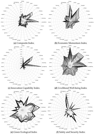 According to Equations (1)–(8), the comprehensive index of China’s historical high quality economic and social development level and each dimension index were measured; the results are shown in Figure 1. The values corresponding to the curves closer to the heart of the circle are smaller and increase as the curve spreads towards the periphery. As can be seen from Figure 1a, the part of the composite index curve near the center of the circle is sparse, and the off-center curve is denser, reflecting the convergent development trend for each province from 2000 to 2019; except for Jiangsu, Guangdong, and Zhejiang, which have a relatively high composite index, most of the provinces’ economic and social development are neck and neck in terms of quality. However, there are still a few regions at a relatively low level, and the differences in development between regions do not show a significant reduction over the entire sample period, suggesting a persistent regional imbalance in the overall level of economic and social development. As can be seen from Figure 1b, the economic momentum of China’s provinces is uneven, and there are two poles in the spatial distribution, namely, Beijing and Shanghai, and the economic momentum index varies widely by province. Hubei, Chongqing, Shaanxi, and Fujian, for example, have achieved relatively substantial growth in the past two decades and still have high potential for future development. As can be seen from Figure 1c, the unevenness of innovation capacity across provinces is more pronounced than for economic momentum, with Jiangsu, Zhejiang, and Guangdong having high innovation capacity indices, while the other provinces are at lower levels. As can be seen from Figure 1d, the livelihood well-being indices of all provinces show year-on-year improvement, with Beijing and Guangdong consistently displaying relatively high levels of development during the sample observation period, which is closely related to the good policy environment and economic strength. As can be seen from Figure 1e, the unevenness of the green ecological index is relatively low compared to the other dimensions, with all provinces showing rapid green ecological development, thanks to China’s co-ordination of ecological protection and economic development to maximize ecological and economic benefits, as well as the rapid increase in the curbing of total emissions of major pollutants. As can be seen from Figure 1f, the security index is significantly higher in Heilongjiang, Shandong, and Henan provinces, mainly because these three provinces are large grain provinces and have made outstanding contributions to ensuring national food security.