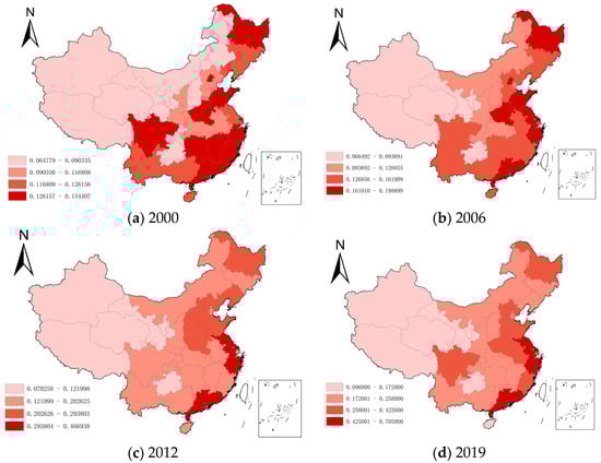 This study selects four time cross-sections, 2000, 2006, 2012, and 2019, and classifies them into four categories-namely, (a) low level, (b) medium-low level, (c) medium-high level, and (d) high level-using the composite index of each year as the benchmark. ArcGIS 10.8 software was used to map the spatial distribution of high quality economic and social development levels. The results are shown in Figure 2.