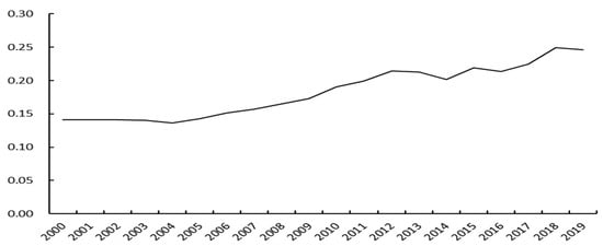 To visually analyze the evolutionary trend of the difference in quality economic and social development in China, the trend of Dagum’s Gini coefficient was measured and plotted according to Equations (9)–(18), as shown in Figure 3. The overall difference in the level of development in China from 2000 to 2019 shows a fluctuating increase, with Dagum’s Gini coefficient rising from 0.141 in 2000 to 0.246 in 2019, with an average annual increase of 5.25%. This indicates a gradual widening of the difference over the sample period, but the Gini coefficient fluctuates between 0.14 and 0.25, within a reasonable threshold. (A Gini coefficient of income equal to 0.4 is a “warning line” according to the United Nations; if the Gini coefficient for income exceeds 0.4, it means that there is a gap in income distribution and inequity. This criterion also applies to the Gini coefficients for education, health, and housing, and each Gini coefficient is negatively correlated with its inequality—that is, the higher the Gini coefficient, the more unequal the corresponding distribution of resources, while, conversely, the lower the coefficient, the more equitable the distribution.) Dagum’s Gini coefficient evolved in two phases, the first being from 2000 to 2012, when the Gini coefficient showed a flattening U-shaped trend, reaching a low of 0.135 in 2004. In the second phase, from 2012 to 2019, the Gini coefficient rose in an M shape, reaching its maximum level of variation over the sample period in 2018, with the overall variation rising through three peaks, the first two with an average annual growth rate of 7.67% and the final two with an average annual growth rate of 4.49%. It is easy to see that the increase of the Dagum’s Gini coefficient has increased in speed, but does not show a strict increasing trend, and the regional development synergy remains weak. For the overall disparities to be sustained and effectively mitigated, there is an urgent need to highlight the leading role of national regional development strategies to effectively narrow regional gaps, alleviate regional economic development conflicts, and enhance inter-regional coordination.