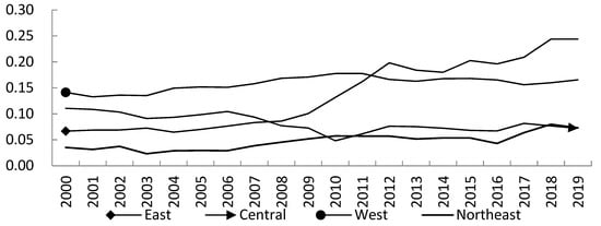 The trends in the evolution of intra-regional differences in terms of the level of quality economic and social development are shown in Figure 4. Overall, the four regions are at different levels of development quality and show significantly different evolutionary trends. From 2000 to 2007, the differences within the four major regions tended to stabilize and ranked as northeast < eastern < central < western. During the period 2007–2019, the four major regions began to show a clearly differentiated trend and ranked as northeast < central < western < eastern. The Gini coefficient for the central region decreased over the sample period in a fluctuating manner, with a steady overall trend. The reason for this is that there is less economic cooperation between cities in this region; the inter-city economic links are not strong, making it difficult to encourage interconnected interaction between cities; The gap between the levels of economic and social development in the region is not large. Dagum’s Gini coefficients for the Northeast and West remain flat, with annual growth rates of 0.46% and 0.49%, respectively. Dagum’s Gini coefficient has risen sharply in the eastern region, with an annual growth rate of 2%, mainly because some provinces and municipalities in the eastern region have seen their level of economic and social development improve significantly faster than other provinces and municipalities in the region, widening inter-regional differences.