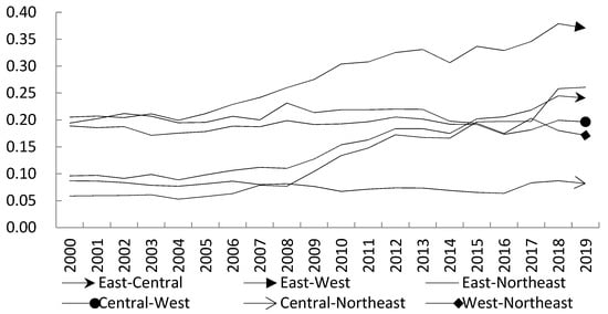 Based on Dagum’s Gini coefficient decomposition method, Figure 5 illustrates the evolutionary trend of inter-regional differences in the level of high-quality economic and social development. During the sample period, the differences between the eastern and central regions, the eastern and western regions, and the eastern and northeastern regions showed a gradual increase, with the average annual increases in regional difference being 0.72%, 0.83%, and 1.01%, respectively. The difference between the central and western regions and between the western and northeastern regions fluctuated between 0.17 and 0.20. The difference between the central region and the northeastern region has been slowly declining, with an average annual rate of decline of 0.02%. Between 2000 and 2004, the inter-regional differences between the West, the East and the Northeast were at the same level, and at this time the Northeast was still at a level of economic and social development comparable to that of the East. Between 2005 and 2019, Dagum’s Gini coefficient declined rapidly in the western and northeastern regions, while Dagum’s Gini coefficient grew rapidly in the western and eastern regions at an annual rate of 0.83% and declined significantly in the central and northeastern regions. The largest inter-regional differences in 2019 were between the eastern and western regions, followed by the eastern and northeastern regions, the eastern and central regions, the central and western regions, the northeastern and western regions, and the central and northeastern regions.