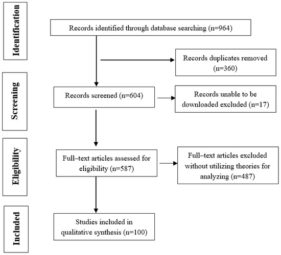 According to Liberati et al. [20] and Wang and Yeh [24], the PRISMA statement (Preferred Reporting Items for Systematic Reviews and Meta-Analyses Statement), a four-phase flow diagram, focuses on ways in which transparency can be ensured. The PRISMA was considered the standard procedure for data extraction. Therefore, it was employed in this step. The process includes four phases: identification, screening, eligibility, and included studies. Detailed information is revealed in the following Figure 1 and Table 1.