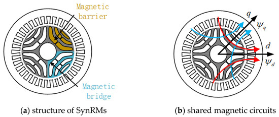 The electromagnetic torque of SynRMs is generated by an anisotropic rotor with a magnetic barrier in the coupled magnetic field [28]. The main rotor topologies are axial lamination (ALA) and transverse lamination (TLA). In general, the two rotor structures’ internal mechanism of the torque generated is the same. As shown in Figure 1, due to the material properties of the rotor, there is inevitably a self-saturation effect in the d-axis and q-axis magnetic circuits. In addition, due to the sharing of magnetic circuits, there is a cross-coupling effect between the d- and q-axis magnetic linkages. The nonlinear behavior mechanism of the two rotors is the same, and the following general modeling method can be used.
