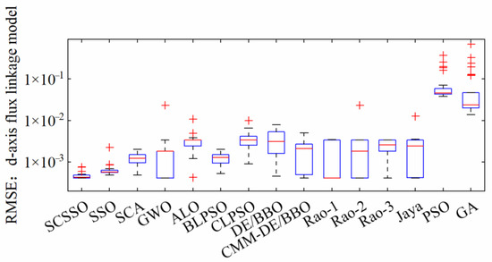 It can be seen from Figure 10 that the estimated data suit the reference perfectly. Moreover, the errors of d-axis flux linkage are below 1%. Table 5 lists the best estimated parameters and the best RMSEd (4.0816 × 10−4) of different algorithms. The SCSSO keeps the best RMSEd value (4.0816 × 10−4). Table 6 illustrates that the best RMSE values of the 11 algorithms are resultant, but the mean value, the worst RMSE and standard deviation of the 11 compared algorithms are orders of magnitude larger than the proposed algorithm. Especially with DE\BBO, its mean value was almost 10 times that of SCSSO. The worst RMSE value of GWO was nearly 20 times that of the proposed algorithms. Additionally, the standard deviation of GWO was nearly 60 times that of SCSSO. The SCSSO has superior performance to SCA and SSO in any aspect.