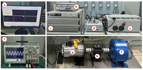 Experimental platform of SynRM prototype: (a) PC with software of dSPACE ControlDesk; (b) Torquemeter; (c) 9 kW DC power supply; (d) MicroLabBox dSPACE ds1202; (e) Customized three-phase inverter; (f) Oscilloscope; (g) 2 kW SynRM prototype with resolver; (h) Torque sensor; (I) Hysteresis brake.