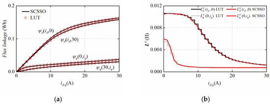 Comparison between LUT and SCSSO. (a) Flux linkages between LUT VS SCSSO. (b) Incremental inductances LUT VS SCSSO.