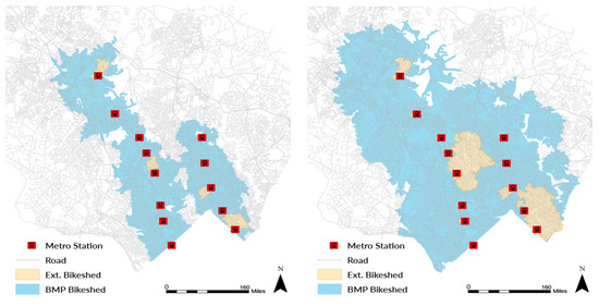 29], after the construction of new infrastructure under their BMP (hereafter referred to as existing and planned infrastructure). The BMP proposes extensive improvement projects including the addition of bikeable shoulders, neighborhood connectors, neighborhood greenways, off-street trails, priority shared lane markings, separated bicycle lanes, and side paths. It identifies more than half of these proposed improvements as new infrastructure (Maryland-National Park and Planning Commission: Montgomery County, 2018a) [