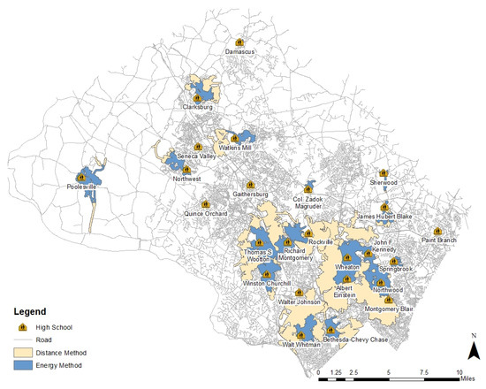 6] with the Montgomery County LTS GIS analysis. The integrated method allows for the delineation of bicycle catchment areas (bikesheds) using biking energy consumption as a travel impedance and LTS values as a traversability restriction. Utilizing energy consumption enables analysts to consider elevation change by incorporating effort, or energy, required to complete the trip as a variable expressed in joules. Using this energy consumption impedance, a bike accessibility analysis was conducted with metro stations and high schools as trip origins. Although the importance of topography has been noted in other studies, few have incorporated elevation change into analyses and none have combined energy consumption with an evaluation of the quality of the bicycle network as provided by the LTS method.