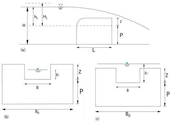 Figure 1a shows a rectangular, compound broad-crested weir. According to the upstream hydraulic head, there can be two cases. First, if the passage of the outlet discharge is only through the central weir (h1 < Z) (Figure 1b), the broad-crested weir performs like a basic weir, and there will be no flow over the compound section.