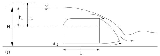 Several studies have been conducted to investigate the combined sharp-crested weir and gate [,,,,]. Negm et al. [] studied unrestricted flow over sharp-crested weirs and underneath gates. They investigated the effect of the geometrical and hydraulic parameters on the structures and reported that the rate of upstream water depth to gate opening (H/d) had major effects on the discharge. Ferro [] presented discharge equations for a simple broad-crested-weir gate using incomplete self-similarity theory and dimensional analysis. Alhamid [] investigated various combinations of weir-like gate proportions for both unrestricted and inundated flow and developed a discharge equation considering the effective parameters.