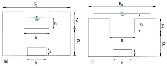 In another case, the water height above the central weir (h1) surpasses the central weir height (Z), and the weir acts as a compound weir (Figure 1c). Furthermore, the critical flow depth (yc) will be greater than the central weir height (Z). In this case, the BCW discharge (Qw) is obtained by Equation (4) [,]: