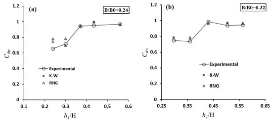 Estimated Cdw using numerical models; (a) Broad crested weir with B/B0 = 0.24, (b)Broad crested weir with B/B0 = 0.32.