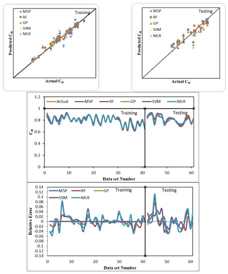 Table 5 also shows that the SVM model outperformed the other models in predicting the Cdt with CC of 0.9585, NSE of 0.8562, MAE of 0.0237, RMSE of 0.0276 and SI of 0.0337 during testing. The SVM reduced the RMSE of M5P, RF, GP and MLR by 32, 7.1, 0.4 and 27%, respectively. However, the difference between GP and SVM was minor. Figure 7 shows that the SVM-estimated Cdt during training and testing was the closest to the best-fit line relative to other models. It confirmed the better performance of SVM compared to the other models. The outcomes of single-factor ANOVA presented in Table 6 show insignificant differences between theactual and predicted values for the different models.