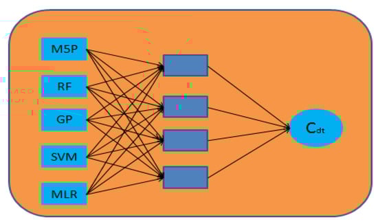 A new multimode ANN model was developed using RF, M5P, GP, SVM, and MLR predicted values. In this novel model, the RF, M5P, GP, SVM and MLR predicted values were used as inputs and the Cdt values were the output. The multimode ANN model was developed using a hit-and-miss process. Figure 8 indicates the structure of the novel multimode model in which five neurons in the input layer and four neurons in the latent layer were selected for predicting Cdt of BCW gate.