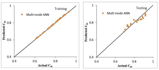 Agreement plot of multimode ANN prediction with observed Cdt of BCW gate during training and testing.