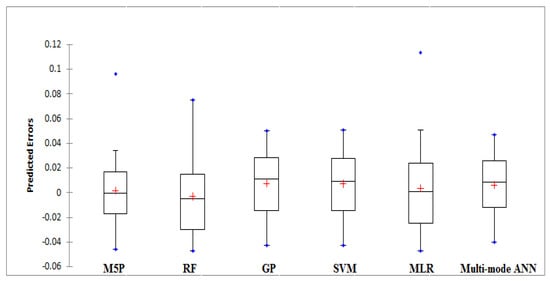 The entire error distribution was plotted using a box plot to evaluate the outcomes (Figure 10). The positive and negative error values indicated the under- and over-prediction tendencies of the models. Table 8 lists the distribution of the overall error. The minimum errors, first quartile, median, third quartile and maximum error are also provided in Table 8 and plotted in Figure 10 for all implemented models. The lower quartile value in the multimode ANN model was −0.0118, which was lower than the other considered models. Figure 10 and Table 8 indicated that the maximum and minimum errors predicted by the multimode ANN model were −0.0400 and 0.0470, respectively, which verify the capability of this model in predicting the Cdt of a BCW gate.
