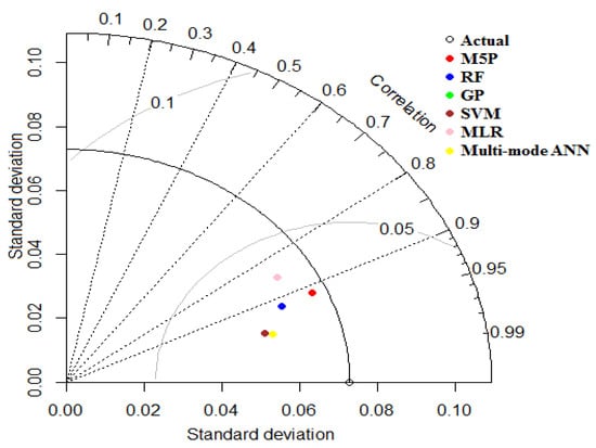 Taylor’s diagram [] in Figure 11 shows the performance of all the developed models in predicting Cdt. Three statistical parameters involving RMSE, CC and standard deviation were used to evaluate the applied models’ accuracy in the Taylor diagram. Figure 11 indicates that the multimode ANN model attained a higher CC with minimal RMSE. The Taylor diagram also confirmed that the performance of the multimode ANN model surpassed the other applied models.