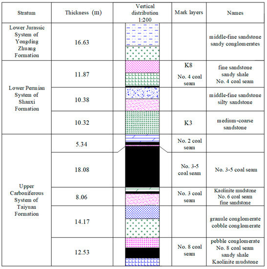 Regarding the correspondence with the overlying Jurassic coal seams, the overlying Jurassic 8#, 9#, 11#, 12#, and 14# coal seams of Yongdingzhuang Mine were mined from 1962 to 1988. The 14# coal seams are 154 to 164 m apart from the Carboniferous 3–5# coal seams. There is no water in the overlying Jurassic coal seam mined-out area.