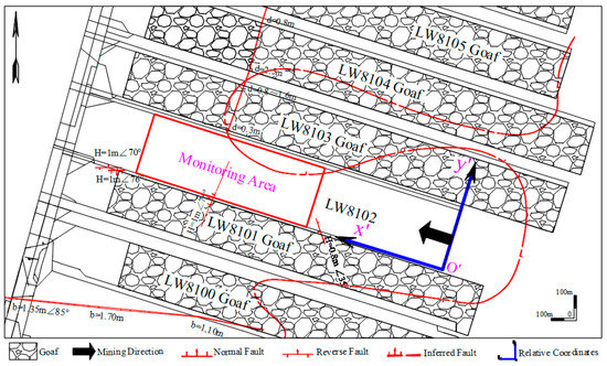 The data recorded on site were the latitude and longitude coordinates, and a relative coordinate system was established, as shown in Figure 2. axis was along the working face advancing direction, and axis was perpendicular to the face. The x and y coordinates of microseismic events were converted according to following the plane rotation and transformation formulas:
