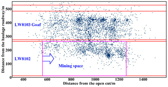 Figure 3 shows the top view of the microseismic event distribution. The microseismic events were found to be distributed in a rectangular shape, and were mainly distributed in the mining space area in the x-axis direction, and in the LW8102 and LW8103 goafs in the y-axis direction. In comparison to the LW8103 goaf, there were no microseismic events in the opposite mining area of the LW8101 goaf. The reason for this is that LW8101 ended mining earlier than LW8103, and the overburden was more stable. This indicates that a longer period of overburden rock stabilization in the adjacent mining zone may weaken the influence on the isolated working face.