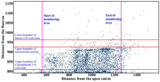 Figure 4 shows the front view of the microseismic event distribution. It can be found from the figure that in the x-axis direction, the microseismic events are distributed above the mining space range of the working face. The maximum range of impact activity in the z axis reached about a z value of 925 m, i.e., 130 m from the roof, which was unaffected by the Jurassic mined coal seam, indicating that the large structure overlying the Jurassic mined coal seam was not reactivated, and had little impact on the mine pressure at the working face.