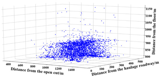Microseismic observations recorded relevant data from 15 October 2020 to 26 May 2021, during which time the workings advanced from approximately 560 m from the open cut to 1260 m from the open cut, with a total of 6648 microseismic events. The study object was the overlying rock in the working face, and a total of 4525 microseismic events were included. These events only included microseismic events above the coal seam floor of the working face, which meant their z-values were greater than 791. The information of each microseismic event included the occurrence time , the values of three-dimensional coordinates , and , and the energy .