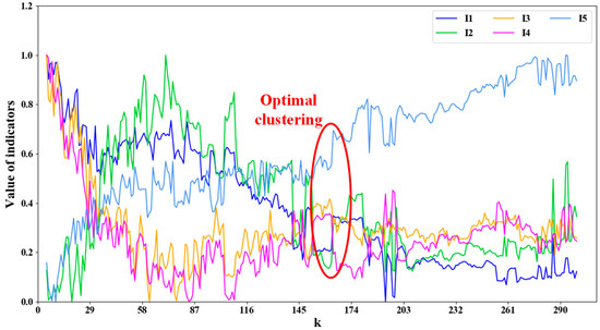 K values were computed from 5 to 300, and the five evaluation indicators were normalized as shown in Equation (13), in order for the evaluation indicators to converge in the range from 0 to 1, thereby allowing simultaneous observation of the clustering effect in the same graph. The curves of evaluation indicators with the k values are shown in Figure 6.
