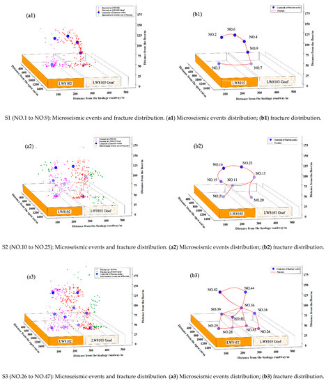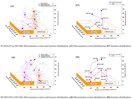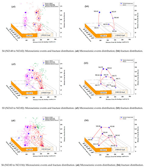 A total of 15 vertical fractures were formed in the eight extensions. A single vertical fracture formed in both LW8102 and LW8103 goafs in each of the extents, apart from S1, S6, and S7. S1 and S7 failed to form a vertical fracture in LW8102. S6 formed two vertical fractures in LW8102, one of which was composed of NO.96 and NO.98, with fewer microseismic events, named S6-1, while the other one was densely distributed with microseismic events consisting of NO.98, NO.99, and NO.101, named S6-2.