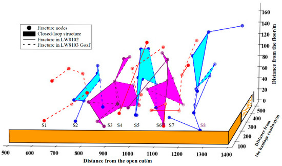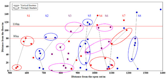 All of the vertical fractures were inclined toward the advancing direction. The low-lying ends were mainly distributed in the coal seam within 10 m from the floor. The high-lying ends varied from 80 m to 151 m from the floor, where S1 and S2 were located at 80 m from the floor; S3, S4, S5, S6, and S7 ranged from 100 to 136 m from the floor, with the highest, S8, reaching 151 m.