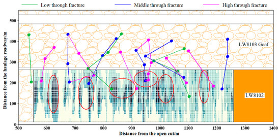 From Figure 8 and Figure 9, it can be found that each extension formed vertical fractures connecting the low and high rock layers in the LW8102 and LW8103 goafs, and through fractures connecting the LW8102 and LW8103 goafs in their high, middle, and low levels. The fractures of some extensions linked to form a closed-loop structure. The vertical fractures and through fractures projected into the front view of the overburden, as shown in Figure 10. According to Figure 8, Figure 9 and Figure 10, the dynamic expansion process and distribution pattern of the overburden fracture could be obtained.
