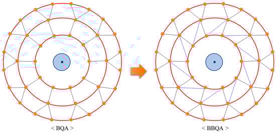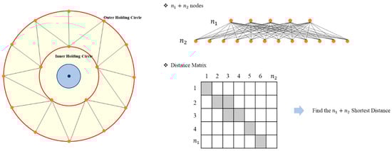 The first step of designing the airspace for BBQA is identical to the SBA. First, find the radius of the holding circle and the optimal holding point arrangement based on the algorithm suggested in the previous study [35]. The second step is to arrange the optimal branch in the airspace determined by methods identical to the SBA. The key to arranging the optimal branch is to find the optimal pair between the holding points that are in the two adjacent holding circles, as shown in Figure 3. In other words, the adjacent holding point should be able to be connected without causing any collision for all pairs that can be moved. As shown in Figure 3, if there are holding points in the inner holding circle and there are holding points in the outer holding circle, it can be altered to a problem to find the optimal link that connects nodes. If the shortest paths out of paths are selected, the optimal combination can be found where no collision between branches occurs, even when the adjacent holding points are connected. Therefore, in this research, we performed steps to produce a distance matrix between nodes and to find the shortest number of paths in the distance matrix.