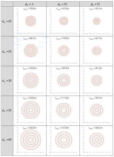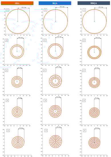 The objective function seeks to minimize the radius of the outermost holding circle in the vertiport terminal control area (VTCA), which suggests using a minimal airspace to operate the vertiport. If the radius is the same, the BBQA model was designed to select the optimal airspace design using , which was applied in SBA as well. is an indicator that checks the difference between the maximum number of holding points in the holding circle and the actual number of holding points, and if is smaller, the airspace design has adequate distribution of holding points. Figure 4 shows an instance in which there are five holding circles, with a maximum airspace capacity of VTCA of 60 eVTOL aircraft. Using the identical airspace as this example, it can be seen that the last instance in which the holding point has = 72.3 and is well-distributed is the optimal airspace design.