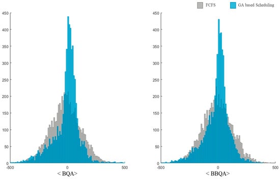 Figure 9 is a histogram of BQA and BBQA’s delay times. To check the excellence of the suggested BBQA model, a series of simulation experiments were performed. The delay time was calculated according to the difference between the actual time of arrival (ATA) and the scheduled time of arrival (STA); if this value is negative, it signals an early arrival. The delay time distribution difference between BQA and BBQA was not very significant. However, the BBQA model, similarly to existing models, had delay times closer to zero when using the genetic-algorithm-based scheduling model compared to when using the first-come-first-served (FCFS) model. Accordingly, it can be confirmed that the scheduling strategy that minimizes the deviation of STA and ATA is implemented well in the BBQA model.
