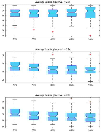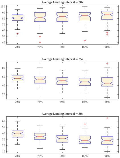 Figure 12 shows the overall performance scenarios of the simulation. The flight data generation needed for the simulation were OTP 70%, 75%, 80%, 85%, and 90%, performed for five different cases and produced 100 sets of flight data per case. The standard for generating flight data was set to 60 eVTOL aircraft attempting to approach for 20 min, so an increase in OTP indicates a possible eVTOL aircraft overload in a certain time period. In addition, for each case, the average landing interval (ALI) was set as 20 s, 25 s, and 30 s. ALI is a parameter that can reflect the vertiport’s landing capacity and can guarantee the of the simulation, in addition to reflecting the congestion of the vertiport. The simulation was performed on both BQA and BBQA under identical conditions, and through 3000 scenarios, we obtained 180,000 vehicle flights for analysis.