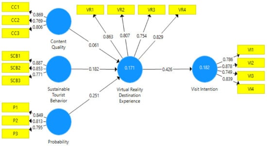 Table 4 depicts that the value of AVE for all constructs is more significant than 0.50. According to [], AVE larger than 0.5 is significant, and the most significant value is 0.703 on the sustainable tourist behavior variable, 0.665 for the content quality variable, 0.671 for the portability variable, 0.663 for virtual reality destination experience and 0.663 for visit intention. Therefore, these values meet the minimum standard of 0.50. The following measure contrasts the value of square root with association amongst constructs in the research model. Table 4 shows that the value of the AVE square root in each construct is more significant than the correlation value. Therefore, the constructed model has good discriminant validity. The composite reliability computation shows that the value is more than 0.7 and AVE > 0.5. Therefore, the value has good reliability and meets the minimum standards.