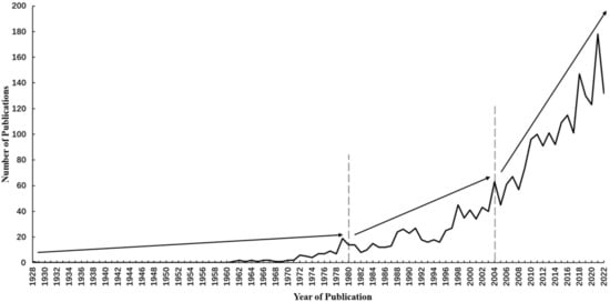 The number of papers on RS increased gradually from 1928 to 2022 (Figure 1), which shows that scholars have gradually paid more attention to RS. According to the trend of the number of papers over time, we divided the research progress of RS into the following three stages: