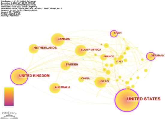 Analyzing publications according to their countries and institutions of origin is helpful in understanding the distribution of research forces and the status of research cooperation between countries, so information about the “carriers” of knowledge is obtained. Papers’ countries and institutions of origin comprise an important indicator of their research contributions. We used CiteSpace to analyze the number of RS papers published in different countries; the top 10 countries and institutions are listed in Table 3. The US ranks first with 1293 publications, far exceeding other countries, while its betweenness centrality is also the highest, followed by the UK, the Netherlands, and other countries. Therefore, the US has made the greatest contribution to RS research and occupies a central position. This also indicates that the geographical origin of publications on the subject of residential segregation coincides with the greatest intensity of the phenomenon in the US. South Africa and China are the only two developing countries on the list, indicating that the contributions from both countries to RS research are gradually increasing (Figure 5). Regarding publishing institutions, the University of Bristol published 54 papers, accounting for 2.51% of the total, thereby ranking first. Next is the State University of New York Albany and the University of Michigan, Ann Arbor. Among the top 10 institutions by the number of publications, the US hosts seven of them, and the other three are from the UK, the Netherlands, and Australia, which further illustrates the leading position of the US in the field of RS research.