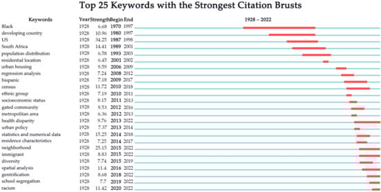During the first stage of RS research (1928–1980), few studies on RS were conducted. Although at this time keywords had not yet broken through, the foundation for RS research was established. During this period, the keyword “Black” began to burst in 1970, with an intensity of 6.68. The burst duration lasted until 1997. This indicated that Black population segregation was the main topic.