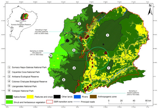 The study was carried out in households involving in the livestock-based livelihood strategy, in an elevational gradient located in the Sumaco Biosphere Reserve (SBR). The SBR has about one million ha [23] and, according to the last multitemporal assessment carried out in 2013, the SBR counted about 53% of primary forest, 28% of secondary forest and 9% of pastureland (81,693 ha) [23]. Three cantons were selected inside the SBR: (a) Arosemena Tola (Lowlands from 400 to 700 masl); (b) Archidona (Middle hills from 701–1600 masl); and (c) Quijos (High mountains from 1600–2000 masl (Figure 1 and Table 1). The complete study area is part of the Uplands Western Amazonia hotspot [14].