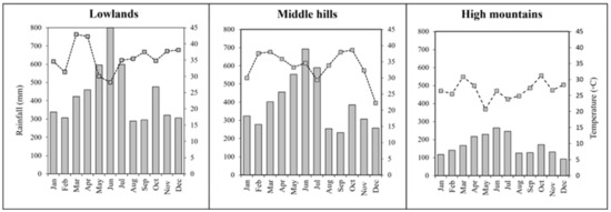 The predominant bioclimatic conditions vary along the elevational gradients, with a mean annual temperature of 35.67 °C and annual rainfall of 5209 mm in Lowlands zone, 33.65 °C and 4728 mm in Middle hills; 26.70 °C and 2205 mm in High mountains zone respectively (Figure 2).