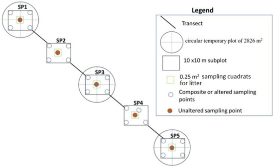The Leaf litter (LL) was calculated within the subplots of 10 × 10 m with the help of a 0.25 m2 quadrat; all the material corresponding to dead plant material (such as leaves, stems, stems, needles, and twigs) that have fallen to the soil and remains located within was collected. The quadrat was placed in the center of the subplot (Figure 3). The collected material was weighed and placed in bags for drying at 105 °C for 24 h, until a constant weight was obtained. The dry matter was calculated in megagrams per hectare.