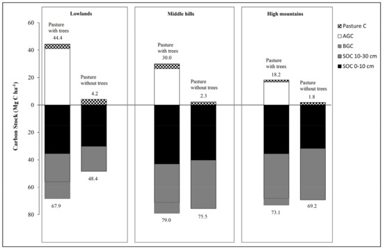 Regarding the pasture without trees or monoculture, the carbon stored both in litter and pasture shows a slight decrease as the altitudinal gradient increases. While carbon sequestration in the first horizon (0–10 cm) reached 30.08, 40.13 and 30.61 Mg C ha−1 for lowlands, middle hills, and high mountains, respectively. In the second horizon (10–30 cm depth), the middle hills and high mountains showed the significantly higher values with respect to the lowlands with ranges of carbon stored from 20 to 32 Mg C ha−1 (Table 3).
