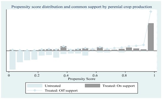 PSM matches the observed outcomes of the treated and the control by creating randomized experiment conditions to aid in evaluating a causal effect in a controlled experiment []. However, the assumption of conditional independence (CIA) is a downside of PSM technology. The CIA states that treatment is regardless of the potential outcomes of a given set of characteristics observed. However, Jalan and Ravallion [] noted that, for cross-sectional data analysis, selection based on the observables is not restrictive but relaxed. The study used PSM as the main technique for estimating the impact of perennial crop production in rural farm households because of the cross-sectional data and the difficulty of identifying right and solely exogenous variables for use in IV. To test the reliability of the PSM estimates, we used the control function estimator within the IV structure. The control function corresponds with the endogenous explanatory variables, which is perennial crop production. This makes the approach to the control function more consistent for linear models. Another important advantage of the control function estimator is that it accounts for multiple heterogeneity sources and the possibility of self-selection, which are factors affecting both observed and unobserved characteristics (For more information on control function estimation in IV, readers should kindly consult Cerulli (2011). A user-written STATA command ivtreatreg was used in the control function estimation.).