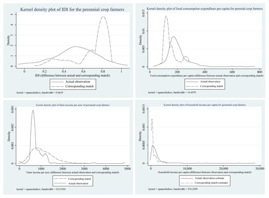 To summarize, one of the shortcomings of PSM is that treatment is chosen based on observed characteristics. Estimates derived from matching processes may be vulnerable to hidden bias because unobserved variables are not taken into account []. The study evaluates the statistical rigor of the estimates obtained using PSM, given the strong assumption put forth by the CIA using the bounded technique proposed by Rosenbaum []. This test determines whether the estimate resulting from matching is resistant to undetected confounders. The Rosenbaum bound (r-bounds) test result is shown in column 5 of Table 5. According to the results in Table 4 (column 5), the lowest r-bound generating a 95% confidence interval is at least 2, 3, 5, and 10 for food consumption expenditure per capita, household income per capita, farm income per ha, and IDI, respectively. This finding implies that ATT estimates are resistant to unobserved heterogeneity as long as the log odds of differential treatment assignment remain above 2 (gamma > 2). Hence, the result that was achieved by the PSM technique was free from hidden biases, and thus there was an increase in the overall welfare of the treated group resulting from the production of perennial crops.