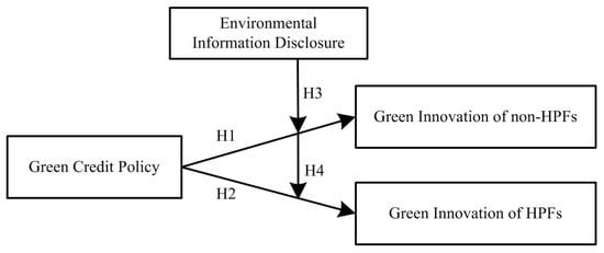 Meanwhile, there has been increasing interest in the intersection between economic environmental policy instruments (e.g., GCP) and information-based environmental policy instruments (e.g., environmental information disclosure) []. The approach that focuses on the GCP-innovation linkage at the firm level can be extended by exploring the effect of environmental information disclosure (EID) []. In particular, EID may impact the potential benefits or costs of GCP, should it interact with GCP to affect firms’ green innovation activities. EID refers to a series of firm behaviors that disclose content such as environmental performance, environmental protection expenditure, and environmental protection income to the public through corporate annual reports, social responsibility reports, corporate websites, etc. [,,]. As Luo et al. argue, firms with a high level of EID can help mitigate manager–owner conflicts and alleviate information asymmetry with stakeholders, hence turning better credit advantages into green innovation []. Thus, it is important to study how EID moderates the relationship between GCP and firms’ green innovation. Surprisingly, the existing literature provides little knowledge about this important issue.
