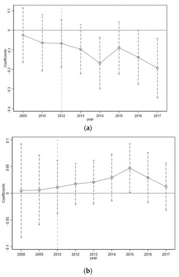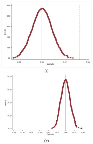 As noted in the previous analysis, the DID presupposes that there is no large variation in firms’ green innovation prior to the policy event (i.e., GCP). The estimated coefficients on the core variables will be insignificant if the policy event is not set in 2012; otherwise, it is likely that there are other unobservable factors that may influence firms’ green innovation []. By referring to existing research [], the placebo test in this study sets the hypothetical time of policy shock as random between 2008 and 2020 to examine whether a policy effect still exists. Figure 3a and Figure 3b report the probability density distribution of the estimated coefficients. The distribution centers around zero and our true baseline estimates from column (1) and (2) of Table 3 (0.0331 and −0.119) are outliers in the placebo test. The placebo test provides evidence that our estimation results are not seriously biased because of any omitted variables [].