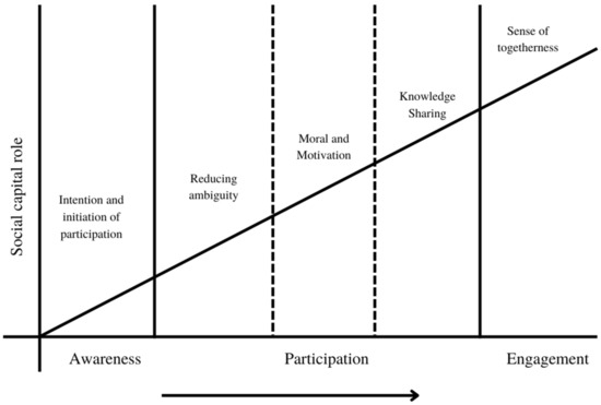 Social capital is a crucial component of linking between and among people as a result of a social system. Social capital joins ownership among several participants in a relationship, differing from other forms of capital. No single player has or is eligible to hold the ownership rights. Even social capital is important when used, but trading it is difficult [,]. For instance, friendship exists amongst people and does not belong to a single individual. This type of relationship’s ownership could not be transferred to others.