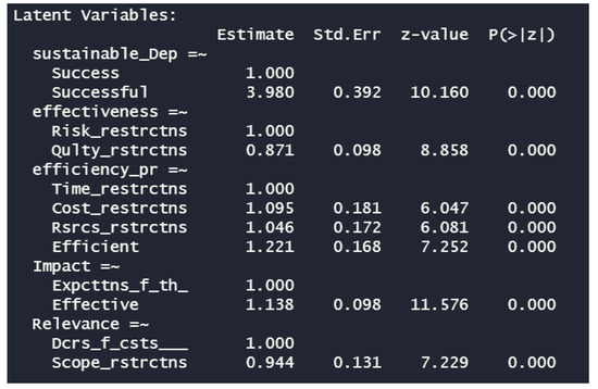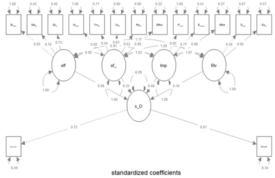 The first part presents the results of the use of SEM in the determination of the sustainable development variable. The information is presented with standardized coefficients to determine the contributions of the variables observed in the determination of the dimensions of the model. The initial structure of the model is presented in Figure 2. In the case of the observed variable of success in projects, significant contributions to the dimension of sustainable development were established; their standardized coefficients are 0.72 and 0.81, respectively, which can be considered significant. Regarding the effectiveness dimension, initially, the observed variables of market share, compliance with risk restrictions, and compliance with quality restrictions were considered. The model showed that only the variables compliant with risk restrictions and project quality contribute significantly with the coefficients of 0.74 and 0.73, respectively. This is an important finding since these two independent variables are associated with the dependent variable knowledge management, explaining their relationship through these significant coefficients.