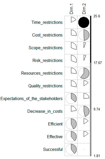 From the principal components analysis, we also identified the contributions of the variables in each of the dimensions, which in the case of Dim 1 includes the variables of efficiency (11.89), effectiveness (10.89), and compliance with stakeholders’ expectations (10,23). In the case of Dim 2, the variables related to compliance with time constraints (25.59), resources (16.19), and costs (13.46) have an outstanding contribution. Figure 6 presents the contributions in detail.